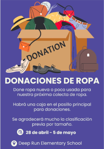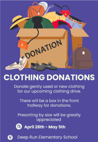 DRES is currently collecting clothing for a Spring Clothing Distribution event at Deep Run on Wednesday, May 7th from 2-4 pm. Please drop off any gently used or new clothing items to Deep Run this week (April 28-May 2).